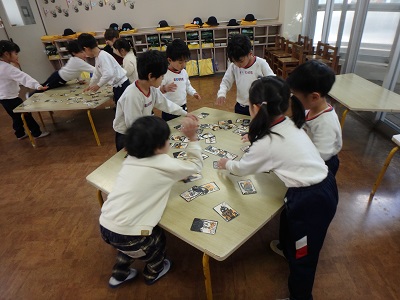 ついにカルタ・コマ大会の決勝戦!!みんな優勝を目指して頑張ってきました。年中、年長さんはコマのひもをまくところからスタートです。ひもの巻き方も練習しました。負けたのが悔しくて泣けてしまい職員室で先生の膝に入って気持ちを整える子、友達を全力で応援する子、優勝して満面の笑顔を見せる子。子ども達のさまざまな気持ちが交差した一日でした。帰り、廊下から声が聞こえてきました。「僕は2枚しか取れなかったんだよ」「でも頑張ったじゃん」「○○くんは9枚も取ったんだ」「すごいね○○くん。2枚だって頑張ったんだから立派だよ!」悔しい気持ちをママに受け止めてもらいながら、子ども達は気持ちをゆっくり整えていきます。