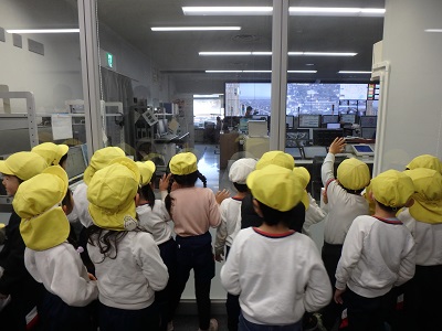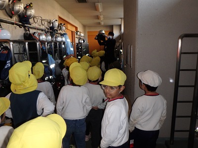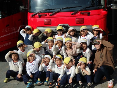 ゆり組さんが、消防署見学に出かけました。行きは、赤電に乗って、消防署のあとは浜松城公園で走り回り帰りは園バスに乗ってと道中も楽しみなプログラム。署では、消防士さんのお話しを聞いたり指令室をガラス越しに見たり・・でもやっぱり一番人気は消防車。みんな「わ~」と目を輝かせていました。