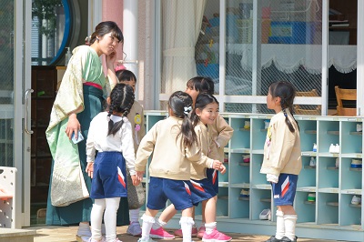 通常保育がスタートして2週間。まだまだ涙がでてしまう年少さん。バスで登園してくる女の子でよく職員室へくる子がいます。昨日もやって来て「このまえさ、泣いてたじゃん。でも今日は泣いてない。」と宣言。「すごいねえ。お姉さんじゃん。」とほめたら「4歳になった!」と胸をはる。「そおなんだ。おめでとう。ほんとにお姉さんだね!!」と言ってあげると、とても嬉しそう。でも今朝も、チョッピリ涙が・・すると「積木やっていい?」と職員室へやって来たので「どうぞ」と出してあげると積み木をやりつつ気持ちを整え「教室に行く」と帰って行きました。帰り際には「月曜日に来るね~」と挨拶に来てくれました。4歳にしてセルフコントロールの術を身に付けています。すごい!将来が楽しみです。