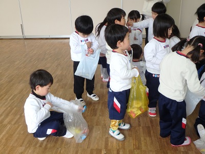 通常保育が始まり1ケ月。年少さんもだいぶ園生活に慣れていました。「見て見て~」「こっち来て」と自己主張が激しい、激しい!ちょっと教室をのぞくと引っ張りだこ状態です。嬉しくもあり・・(笑) この日は、知育教材の「SIあそび」にチャレンジ。同じ形のカニを見つけてカニの家に入れるというもの。お家に入れるのが嬉しくて手当たり次第に入れてしまう子ももちろんいますが、正解を求めるのではなく、その子なりの考えに共感していくのが、この教材の魅力です。子どもたちは「見て見て~カニさんお家に入ったよお」と嬉しそうでした。