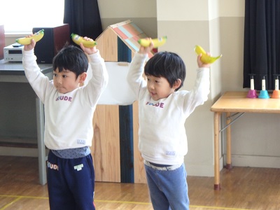 担当のリョウ先生が「魔法だから黄色いスイカを!」とこだわってましたが、スーパーにはなくやむなく赤に。大丈夫、子ども達はすっかりストーリーに浸っているので魔法スイカをガブリ、ガブリ♪ごきげんな様子でした。そもそもこんな3Lのスイカを切ってたべることなんてないから、みんなの前で先生が包丁を入れると「おおおお~」と感動の声が。マグロの解体ショーなみの歓声があがってました。(笑)