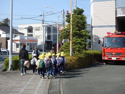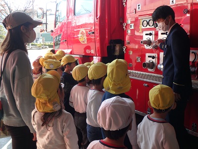 ゆり組さんが、消防署見学に出かけました。行きは、赤電に乗って、消防署のあとは浜松城公園で走り回り帰りは園バスに乗ってと道中も楽しみなプログラム。署では、消防士さんのお話しを聞いたり指令室をガラス越しに見たり・・でもやっぱり一番人気は消防車。みんな「わ~」と目を輝かせていました。